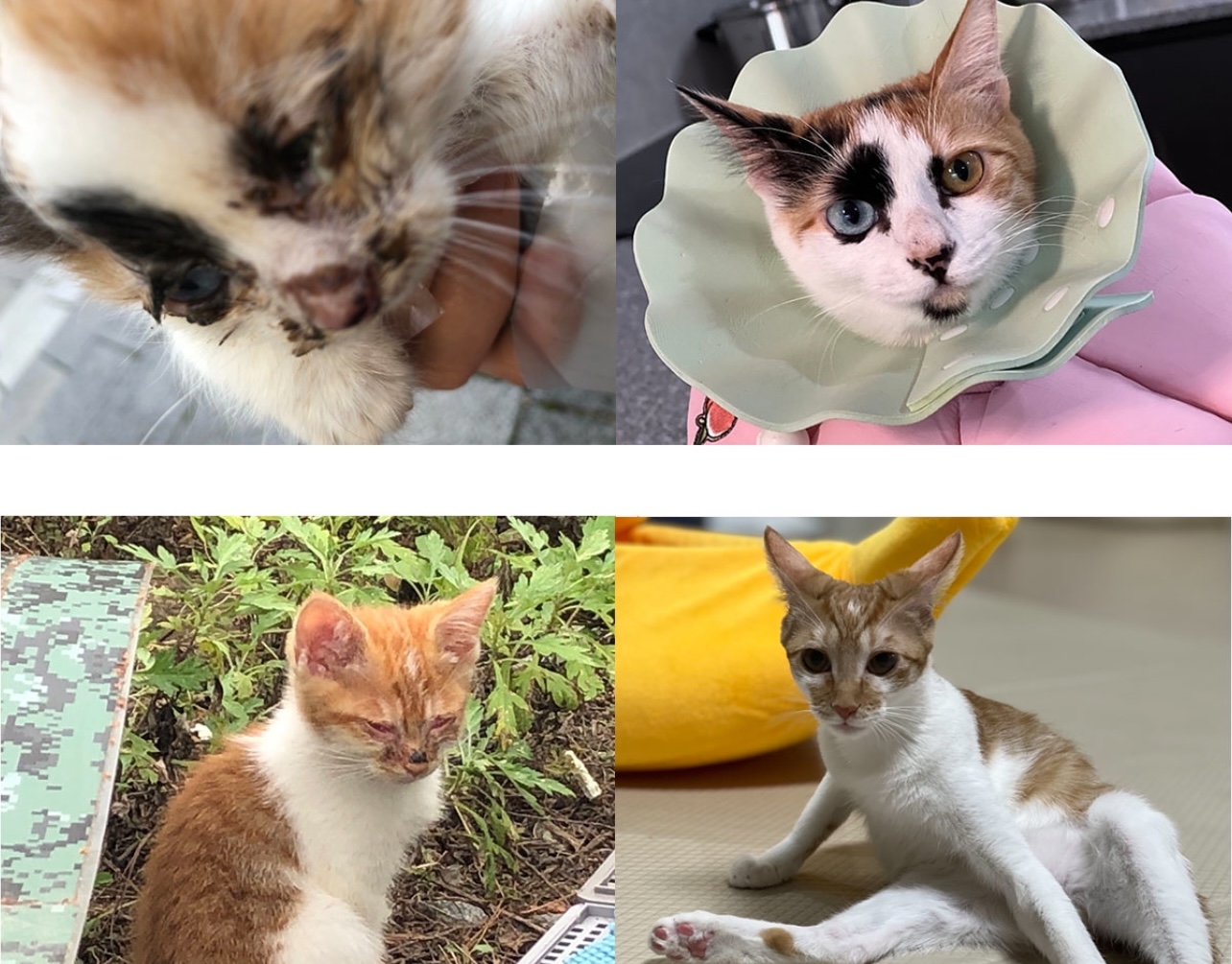 그리고 입양을 보낸 만두와 보리라는 고양이도 허피스 증상으로 결막이 돌출되어 각막 손상이 의심되는 수준이었지만 일주일 정도 입원 치료 후 집에서 한 달 정도 정성껏 관리를 해주니 너무너무 이쁜 모습으로 입양을 가서 현재는 둘 다 새로운 가정에서 사랑받으며 행복하게 생활하고 있어요.