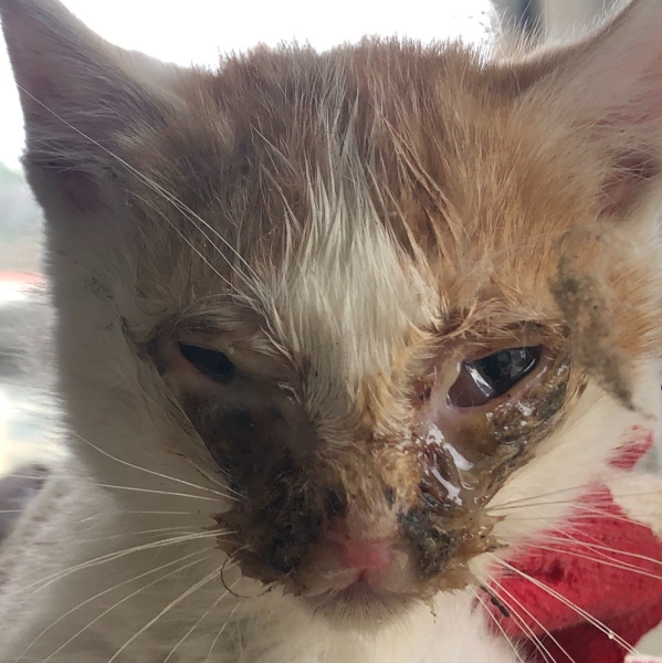 구조 당시에는 대부분 쓰러져 있거나 큰 소리로 울고 있는 고양이를 찾으면 위 사진과 같이 눈에 염증이 있어서 기력이 소진된 채 쓰러져 있거나 큰 소리로 빽빽 울고 있는데요 그중 상당수는 눈에 눈곱이 많이 끼고 고름이 가득 차서 눈동자가 보이지 않을 정도로 눈꺼풀이 붙어 있는 경우가 대부분이었어요.