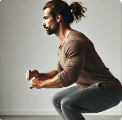 -발을 어깨너비로 벌리고 서서 무릎을 굽혀 앉는 자세를 취합니다.